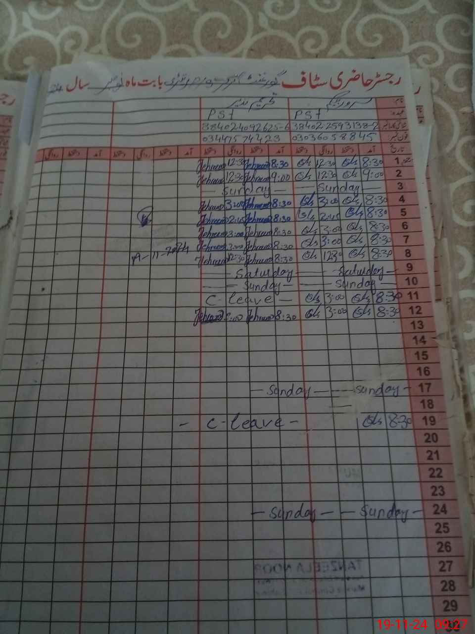 | CNIC | Full Name | Designation | R/C | Absence During Last Calender Month |