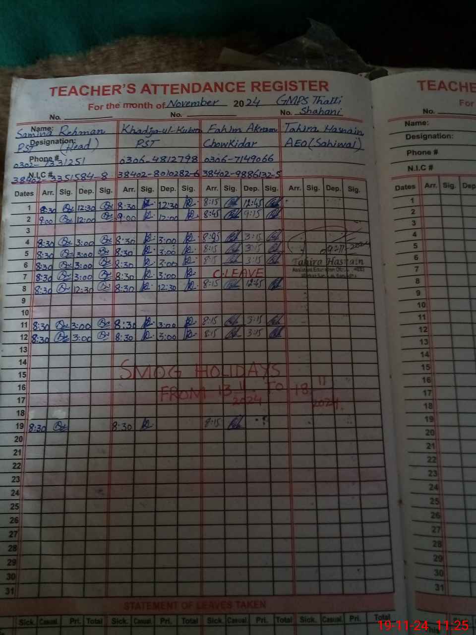 | CNIC | Full Name | Designation | R/C | Absence During Last Calender Month |