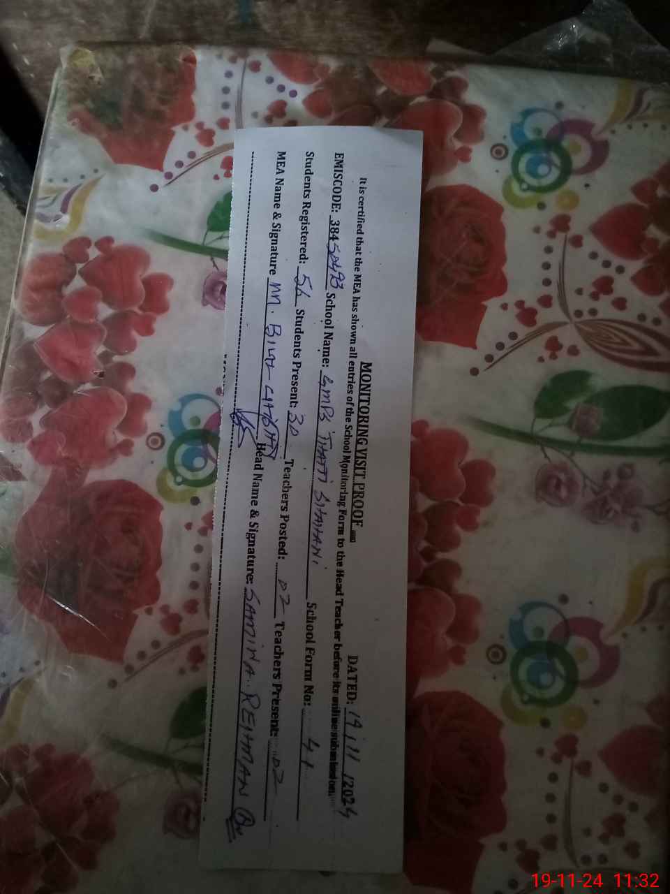 | Certified that this School was Inspected by the Undersigned MEA/DMO Today and the Information Stated Above is as Per Record. | |||||