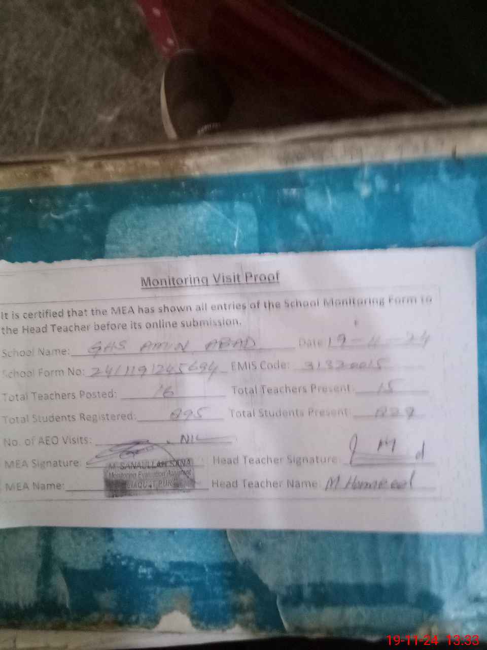 | Attendance Register | Head Teacher | MEA with School | Visit Proof |