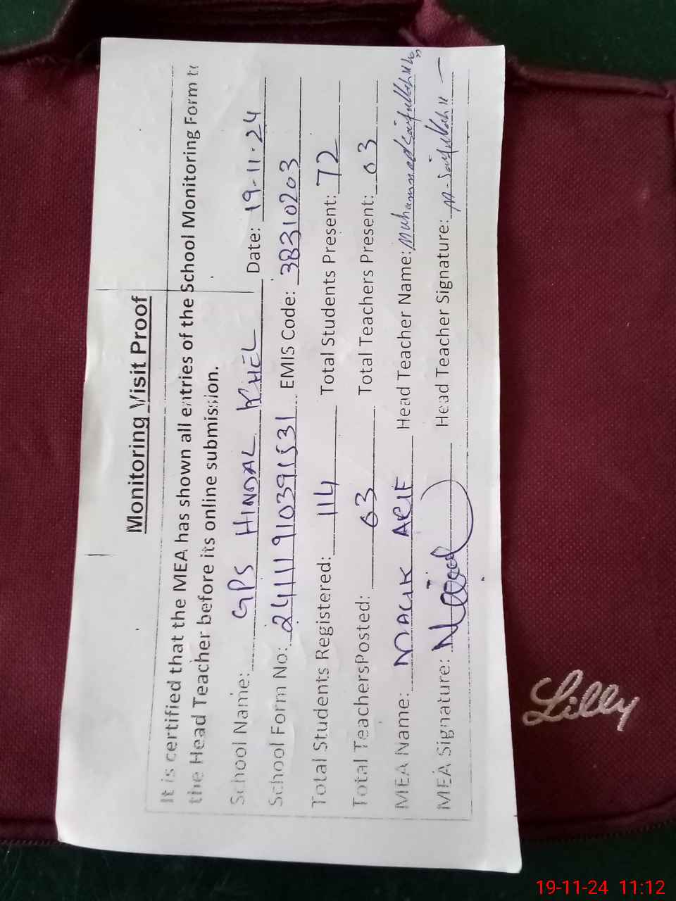 | Attendance Register | Head Teacher | MEA with School | Visit Proof |