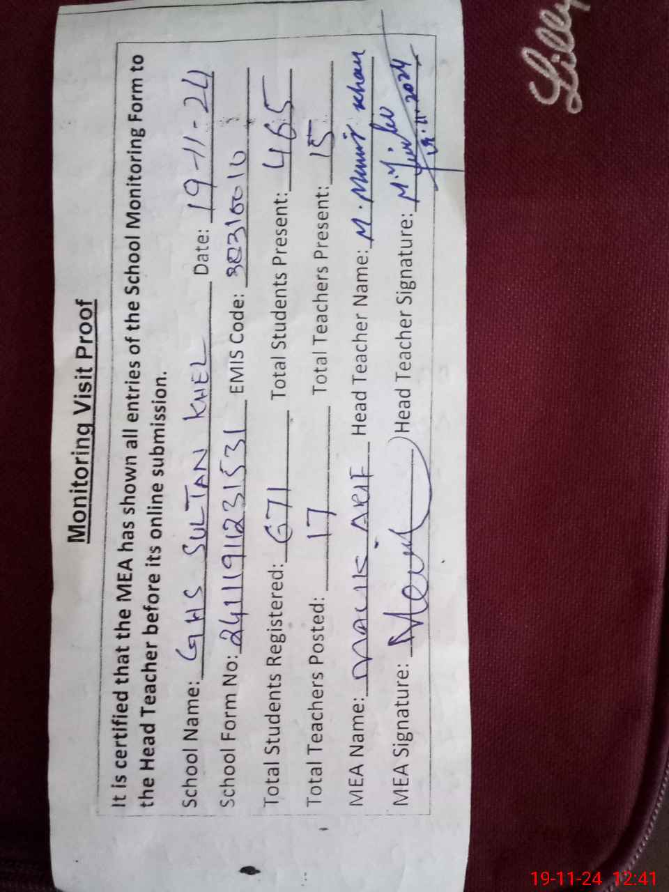 | Attendance Register | Head Teacher | MEA with School | Visit Proof |