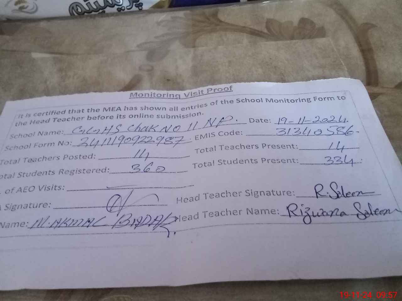 | Attendance Register | Head Teacher | MEA with School | Visit Proof |
