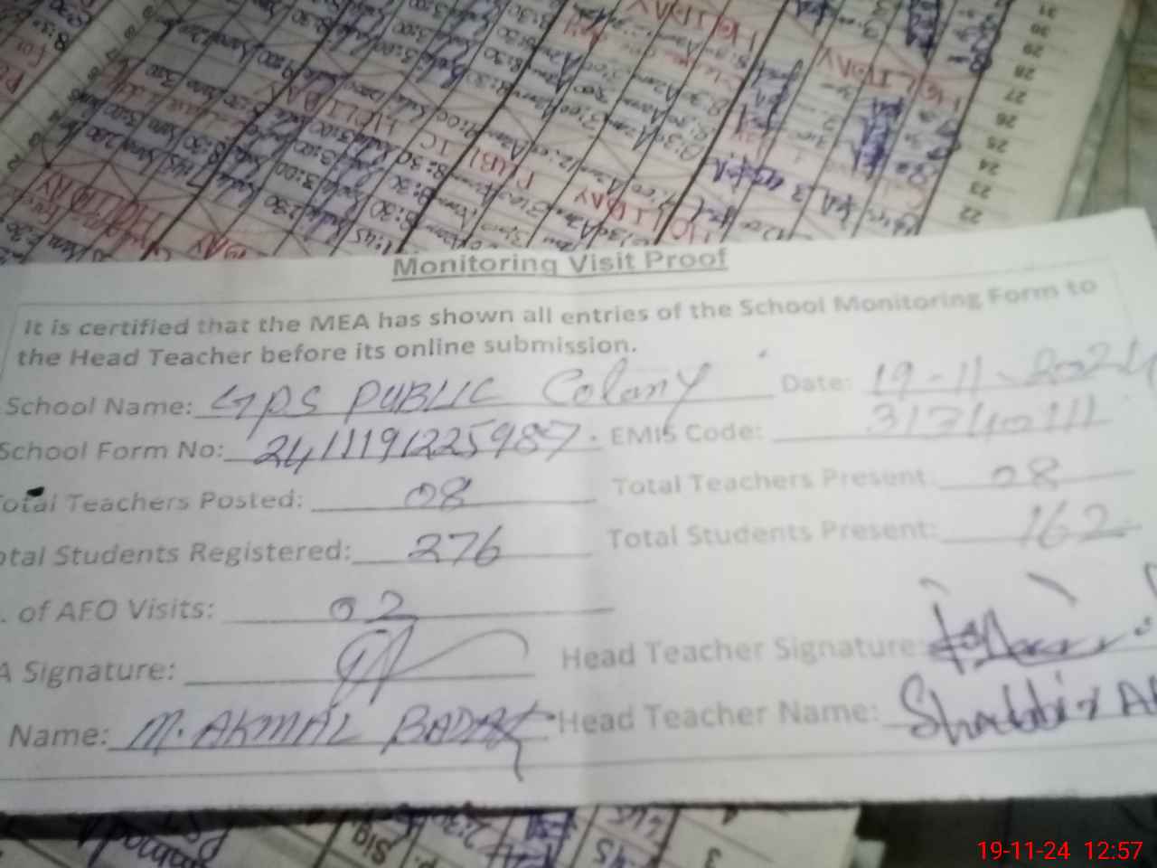 | Attendance Register | Head Teacher | MEA with School | Visit Proof |