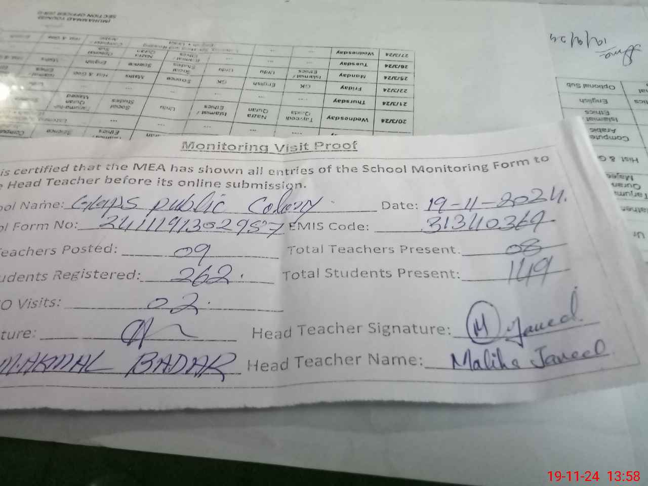 | Attendance Register | Head Teacher | MEA with School | Visit Proof |