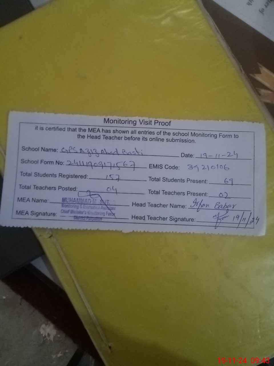 | Attendance Register | Head Teacher | MEA with School | Visit Proof |