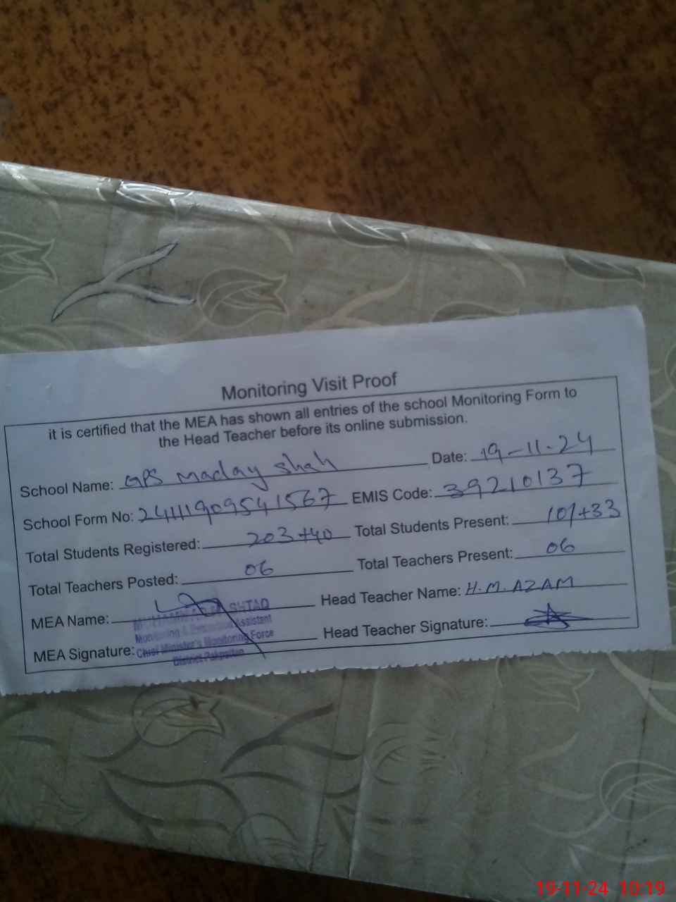 | Attendance Register | Head Teacher | MEA with School | Visit Proof |