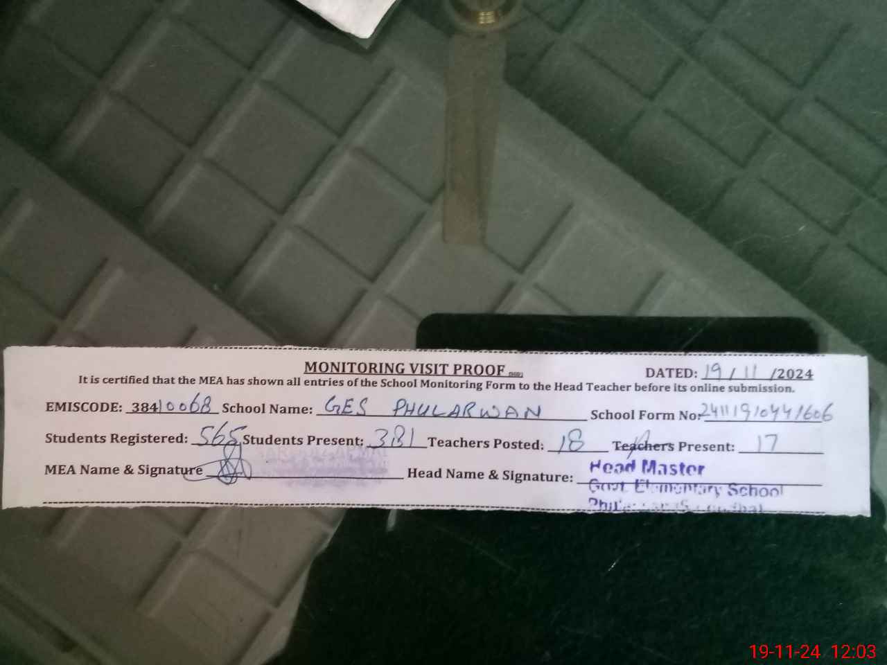 | Attendance Register | Head Teacher | MEA with School | Visit Proof |