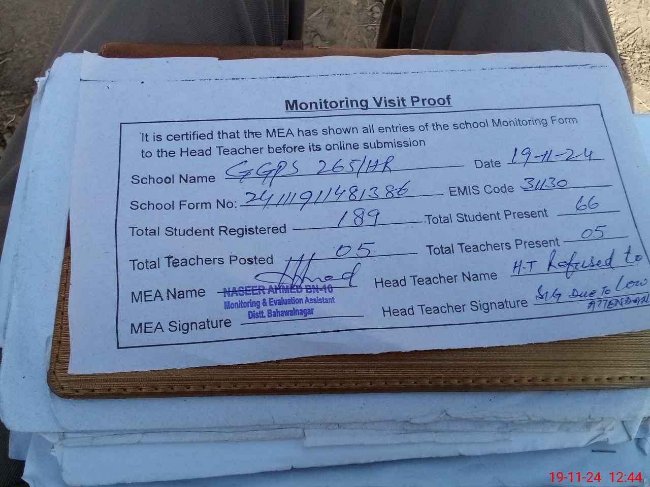 | Attendance Register | Head Teacher | MEA with School | Visit Proof |