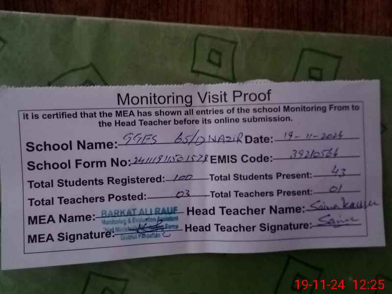 | EMIS Code: 39210564 | Name of School: GGES 65/D NAZIR | |||
