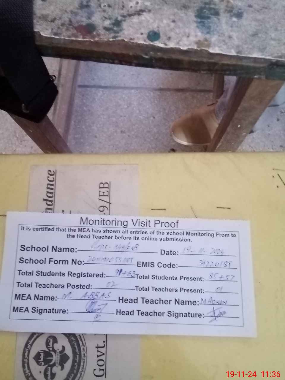 | Attendance Register | Head Teacher | MEA with School | Visit Proof |