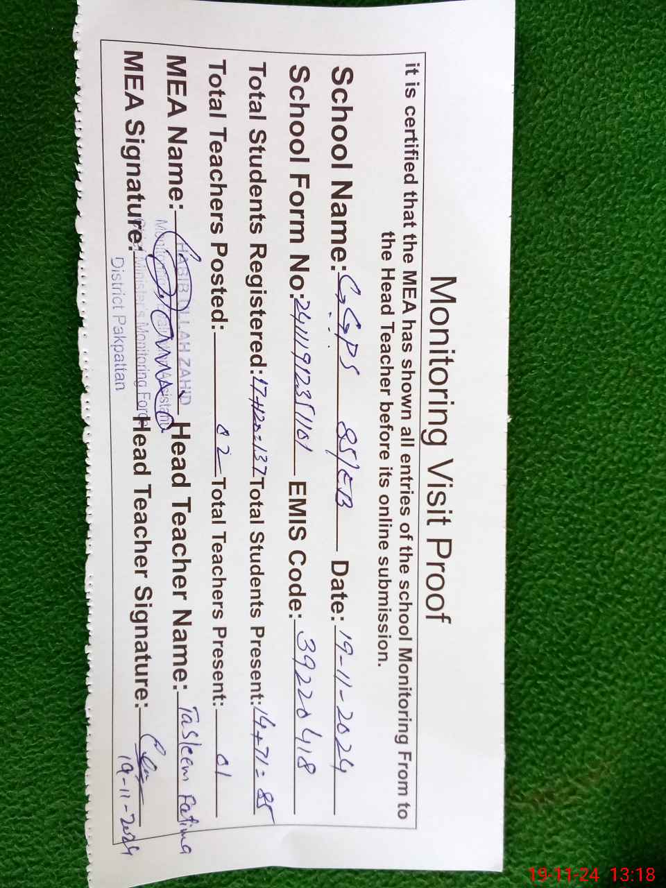 | Attendance Register | Head Teacher | MEA with School | Visit Proof |