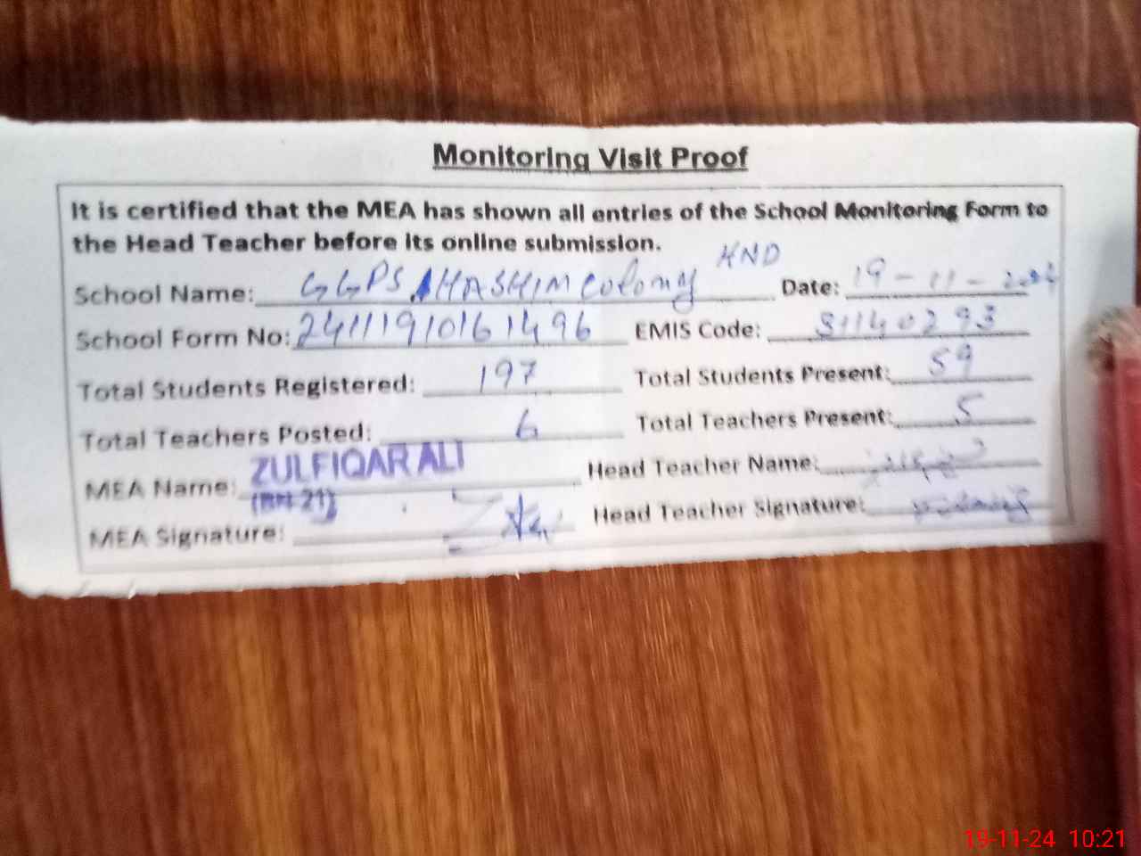 | Attendance Register | Head Teacher | MEA with School | Visit Proof |
