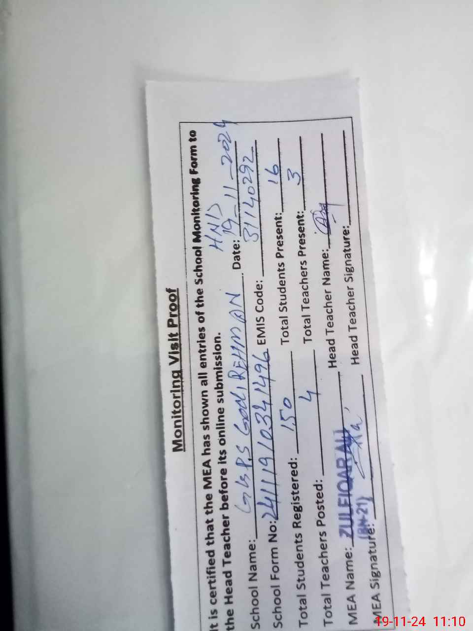 | Attendance Register | Head Teacher | MEA with School | Visit Proof |
