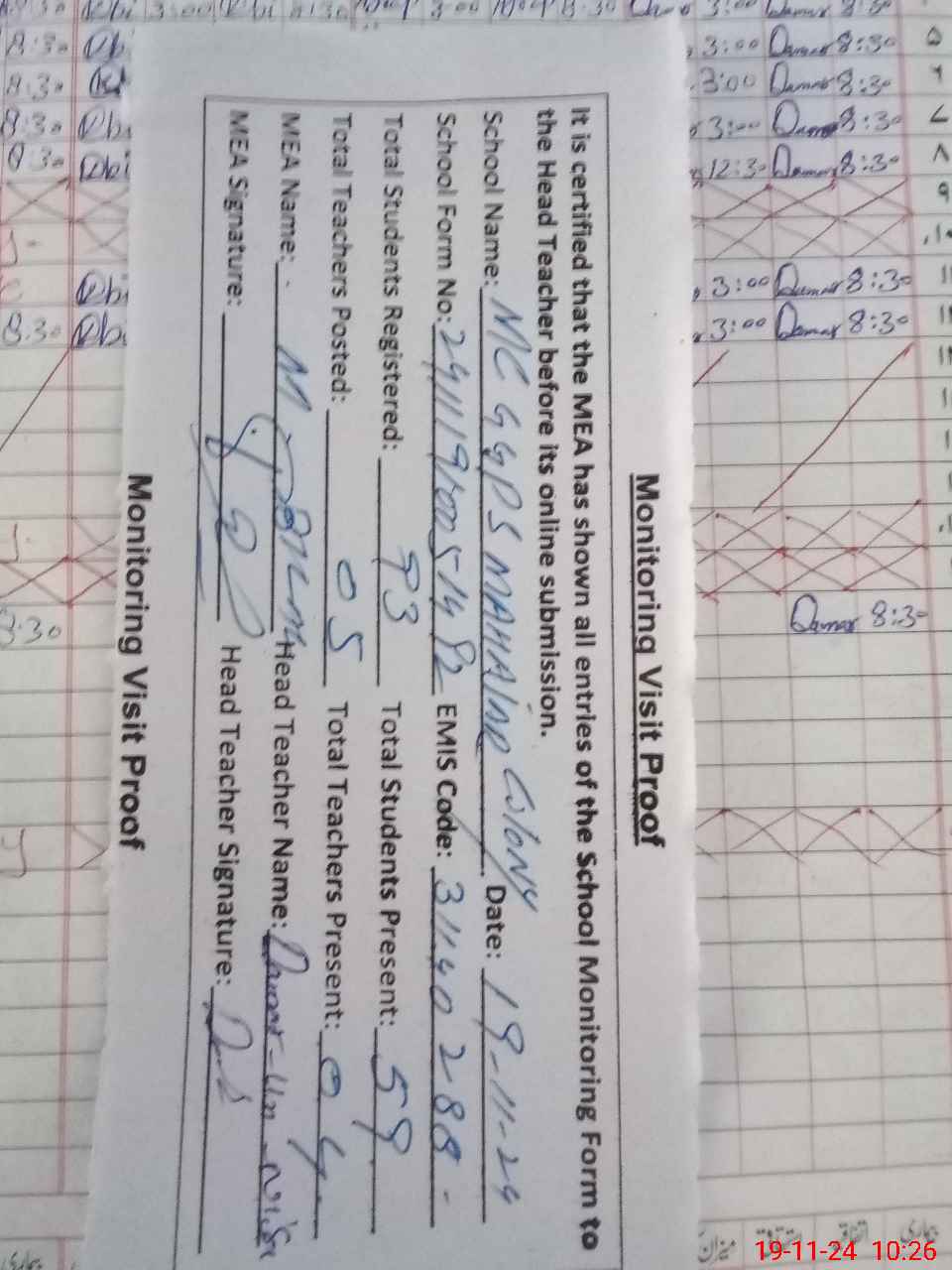 | Attendance Register | Head Teacher | MEA with School | Visit Proof |
