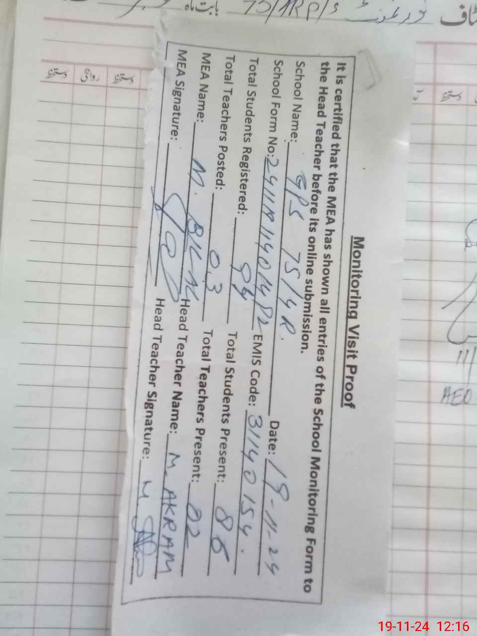 | EMIS Code: 31140154 | Name of School: GPS CHAK NO. 75/4-R | |||