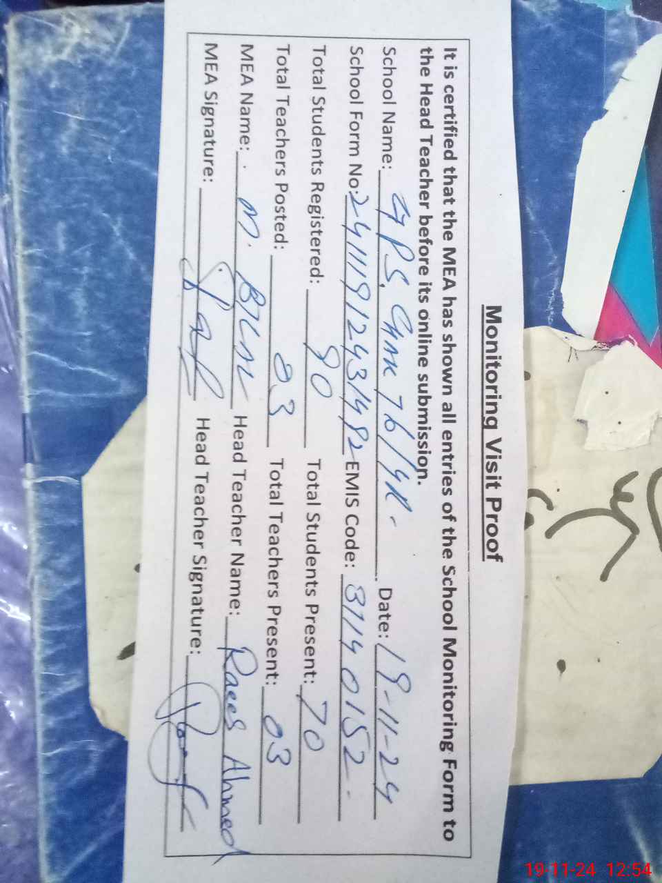 | Attendance Register | Head Teacher | MEA with School | Visit Proof |