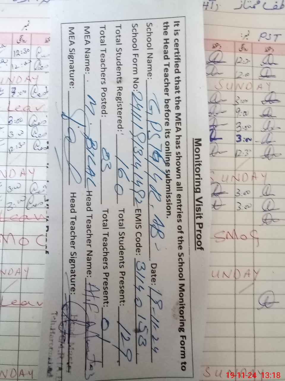 | Attendance Register | Head Teacher | MEA with School | Visit Proof |
