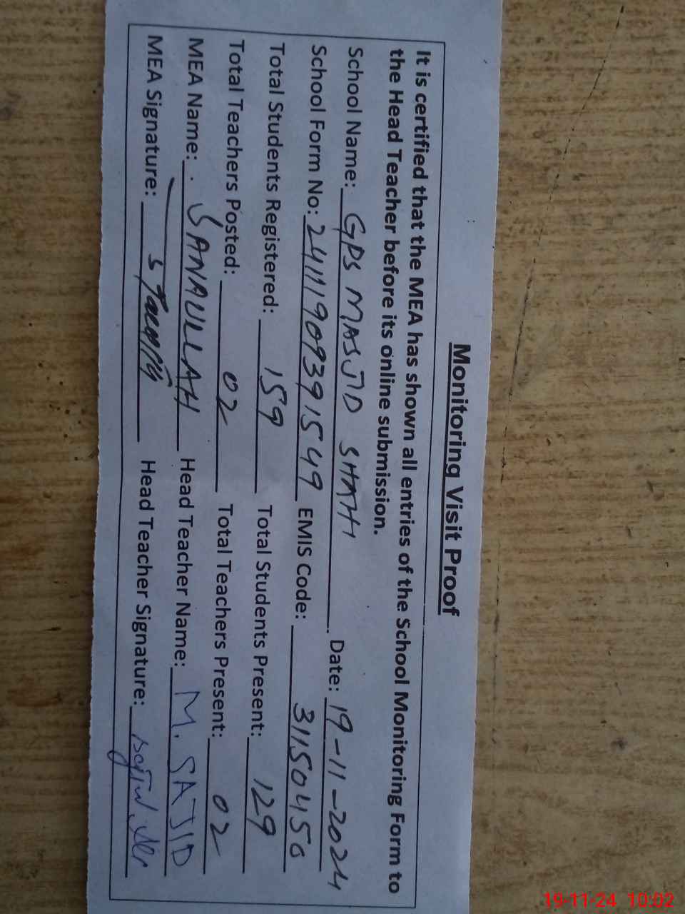 | Attendance Register | Head Teacher | MEA with School | Visit Proof |