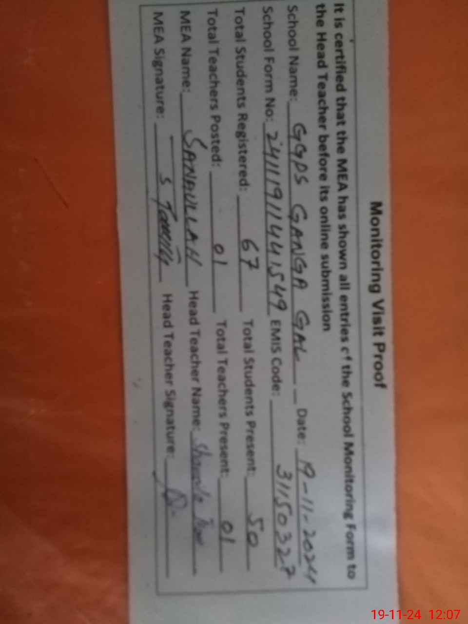 | Attendance Register | Head Teacher | MEA with School | Visit Proof |