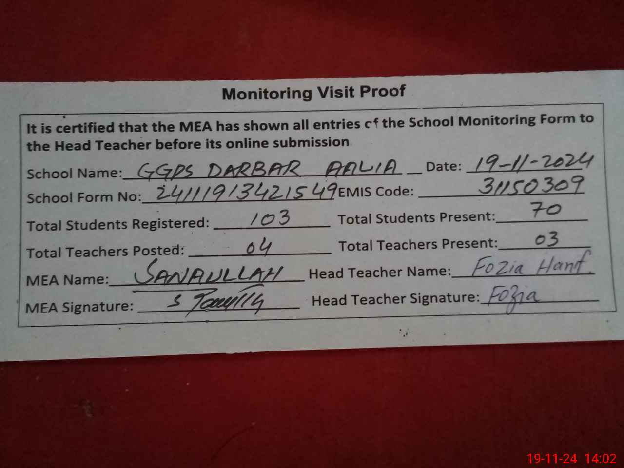 | Attendance Register | Head Teacher | MEA with School | Visit Proof |