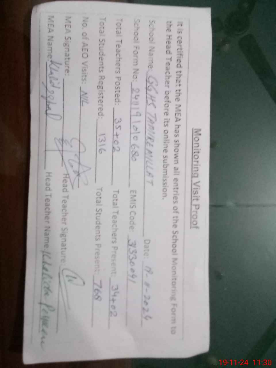 | Attendance Register | Head Teacher | MEA with School | Visit Proof |