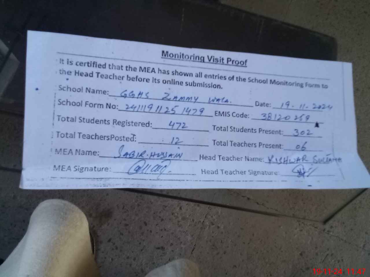 | EMIS Code: 38120259 | Name of School: GGHS ZAMMY WALA | |||