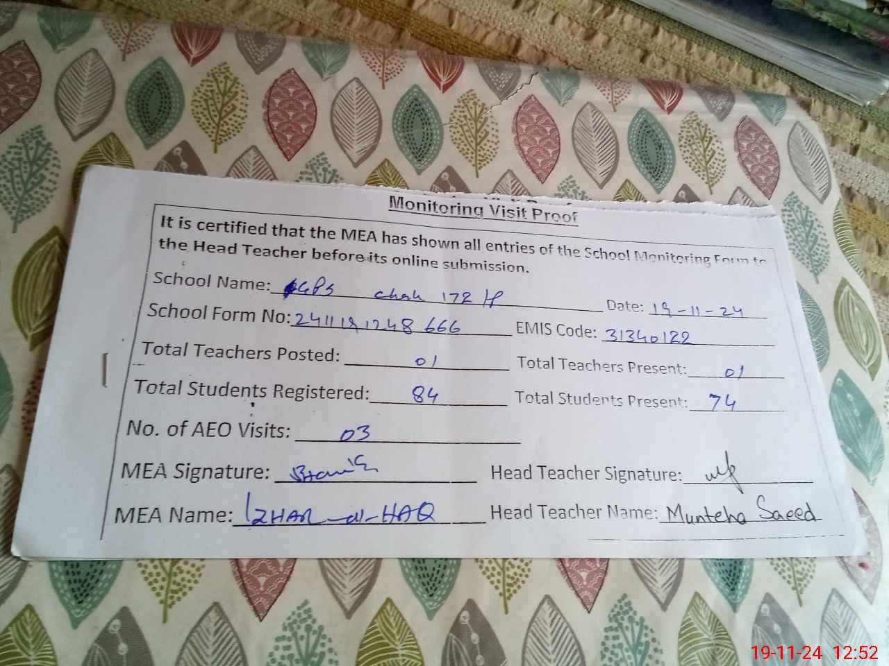 | Monitoring Date: 19-11-2024 | Start Time: 19-11-2024 12:22 PM | End Time: 19-11-2024 12:54 PM | Name of MEA: Mu**** Iz**** UlHa**** | |