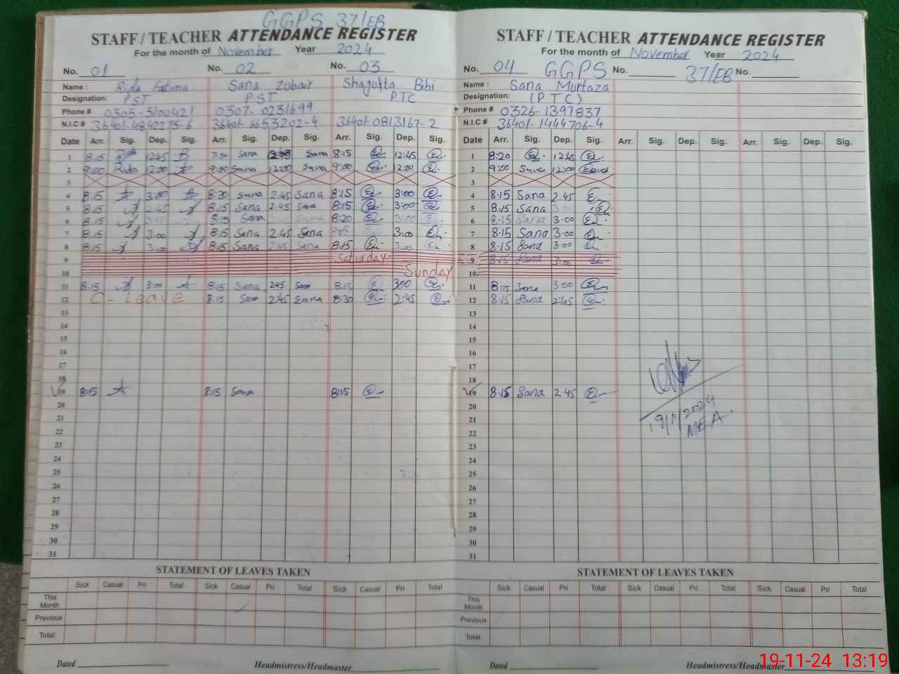 | CNIC | Full Name | Designation | R/C | Absence During Last Calender Month |