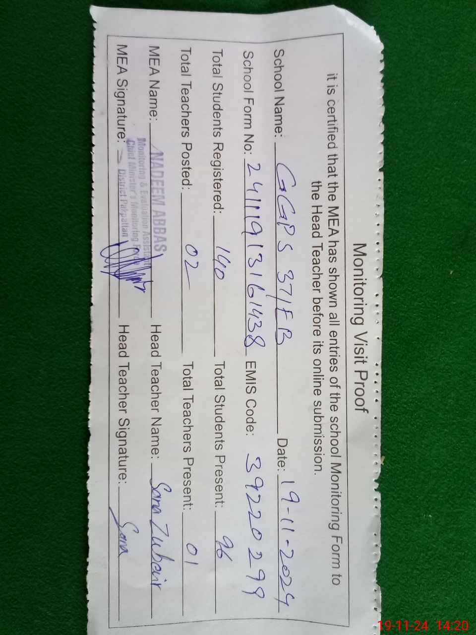 | Attendance Register | Head Teacher | MEA with School | Visit Proof |