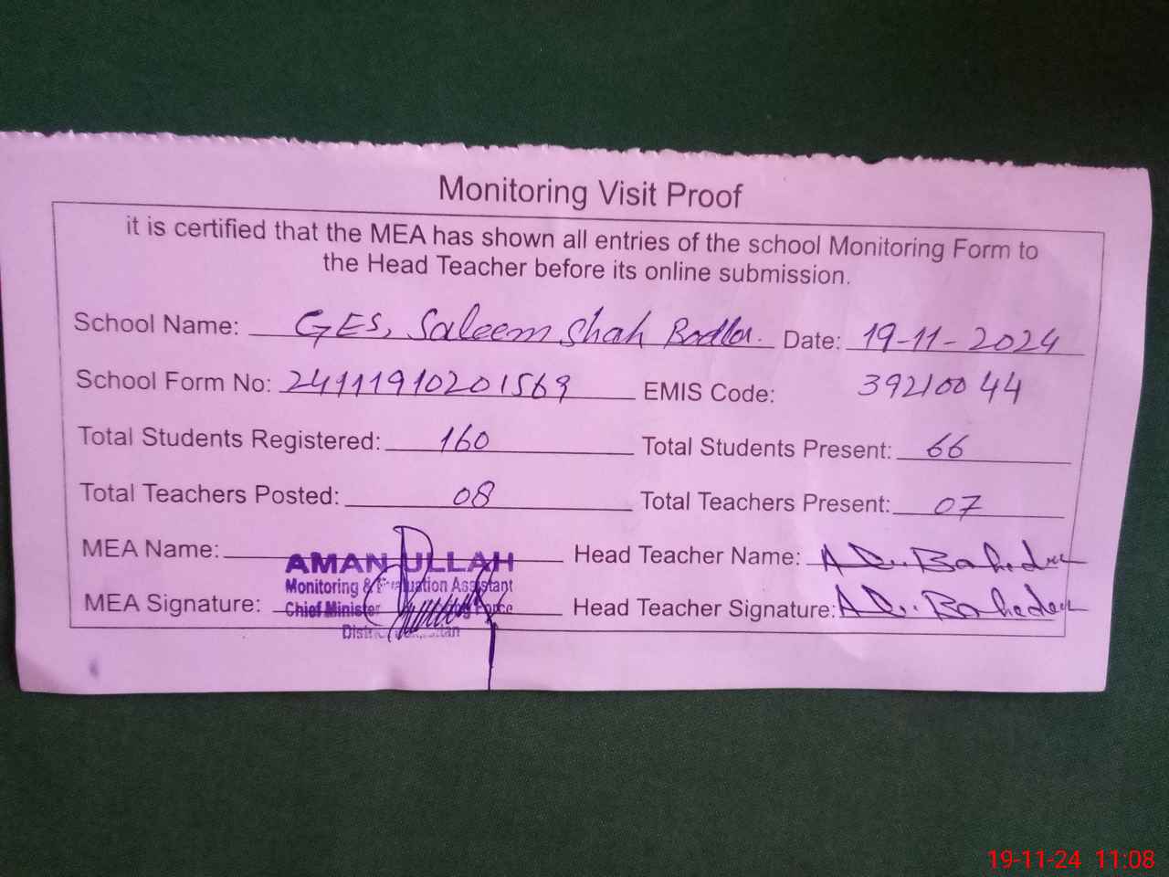 | Attendance Register | Head Teacher | MEA with School | Visit Proof |