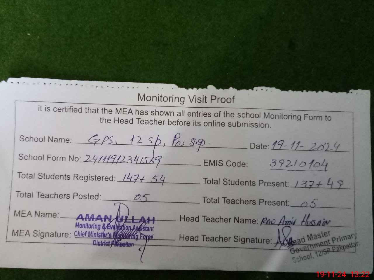 | Attendance Register | Head Teacher | MEA with School | Visit Proof |