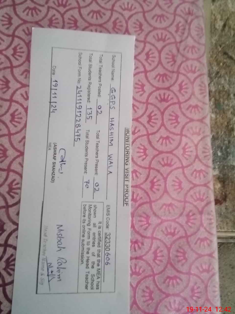 | EMIS Code: 32330606 | Name of School: GGPS HASHIM WALA | |||