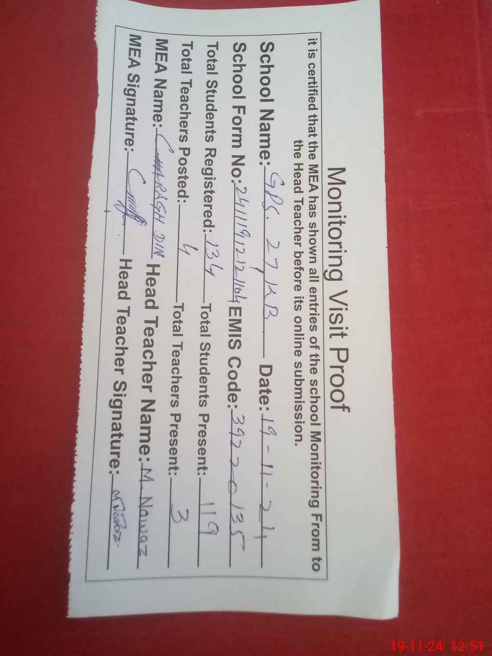 | EMIS Code: 39220135 | Name of School: GPS CHAK NO. 27 KB P.O QABOOLA | |||