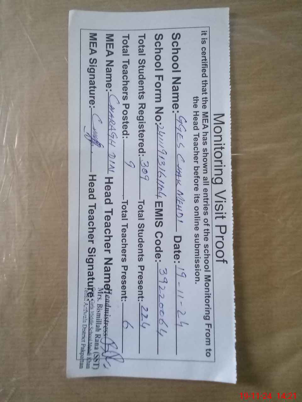 | Attendance Register | Head Teacher | MEA with School | Visit Proof |