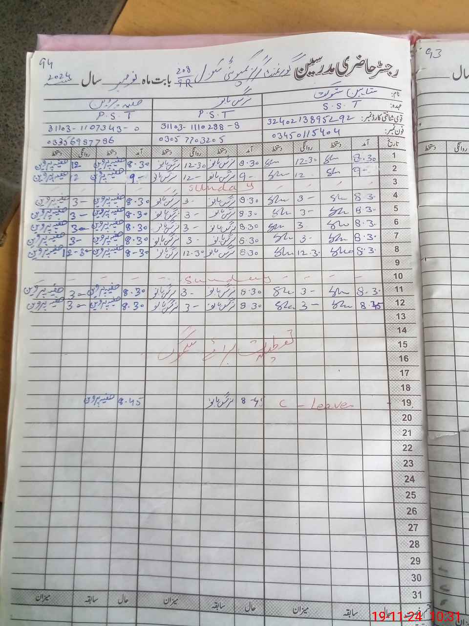 | CNIC | Full Name | Designation | R/C | Absence During Last Calender Month |