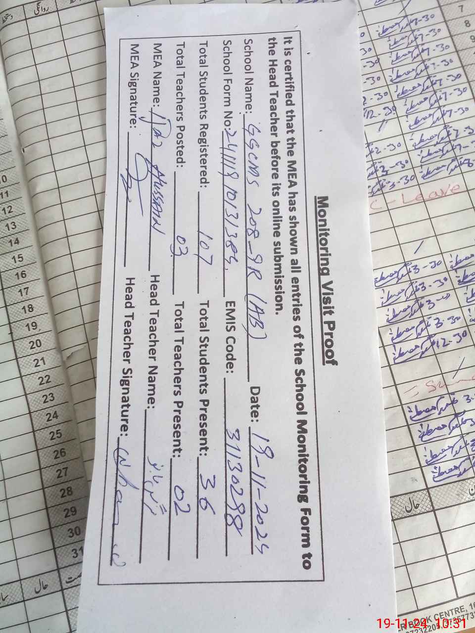 | Attendance Register | Head Teacher | MEA with School | Visit Proof |
