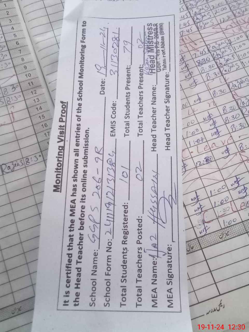 | Attendance Register | Head Teacher | MEA with School | Visit Proof |