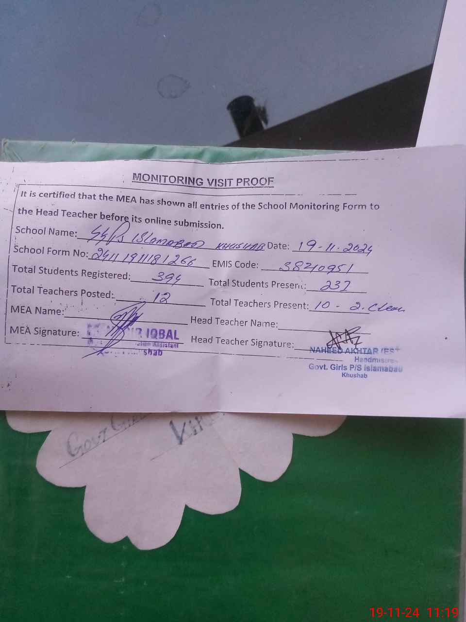 | EMIS Code: 38210951 | Name of School: GGPS ISLAM ABAD KHUSHAB | |||