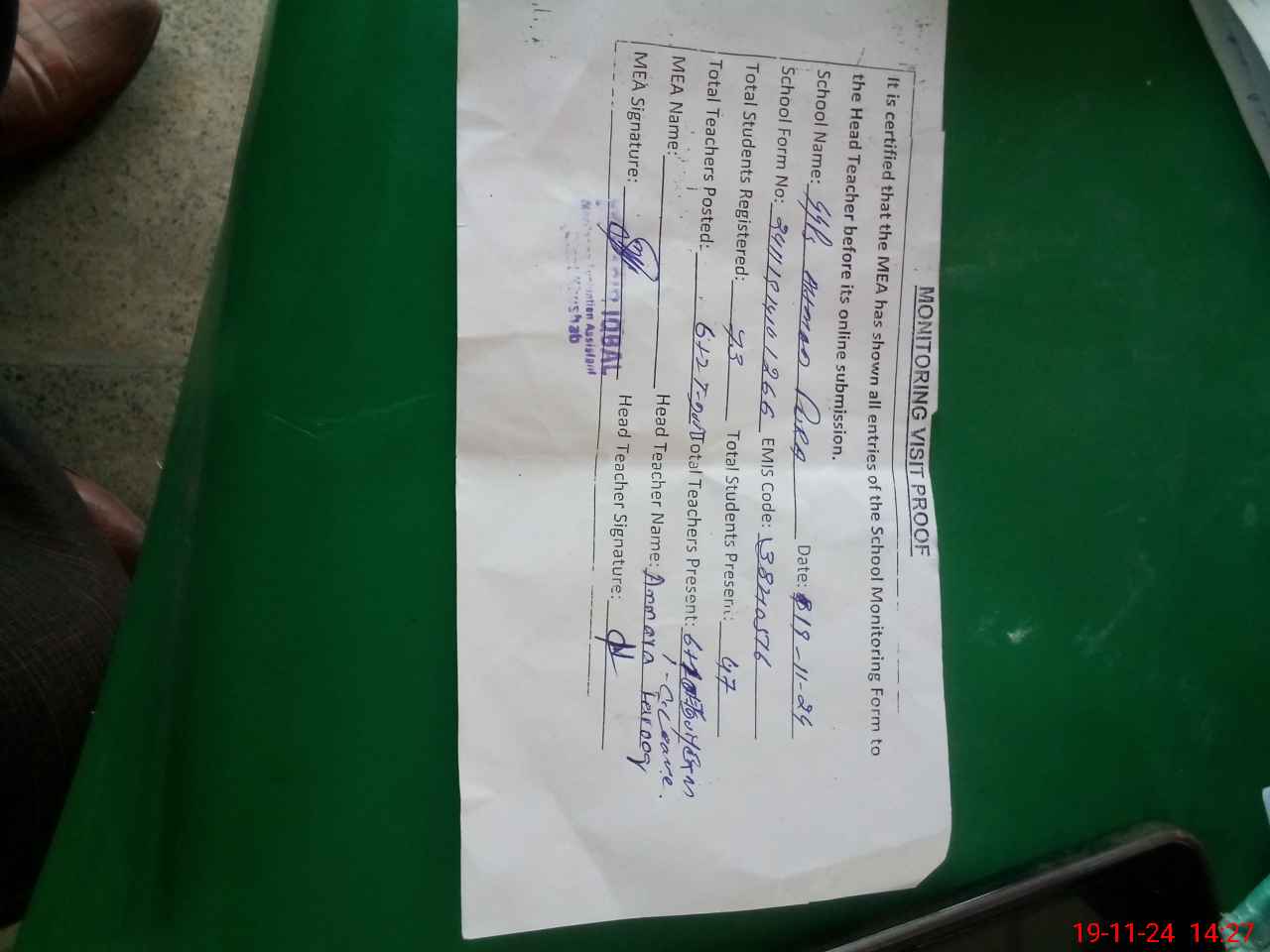 | Attendance Register | Head Teacher | MEA with School | Visit Proof |