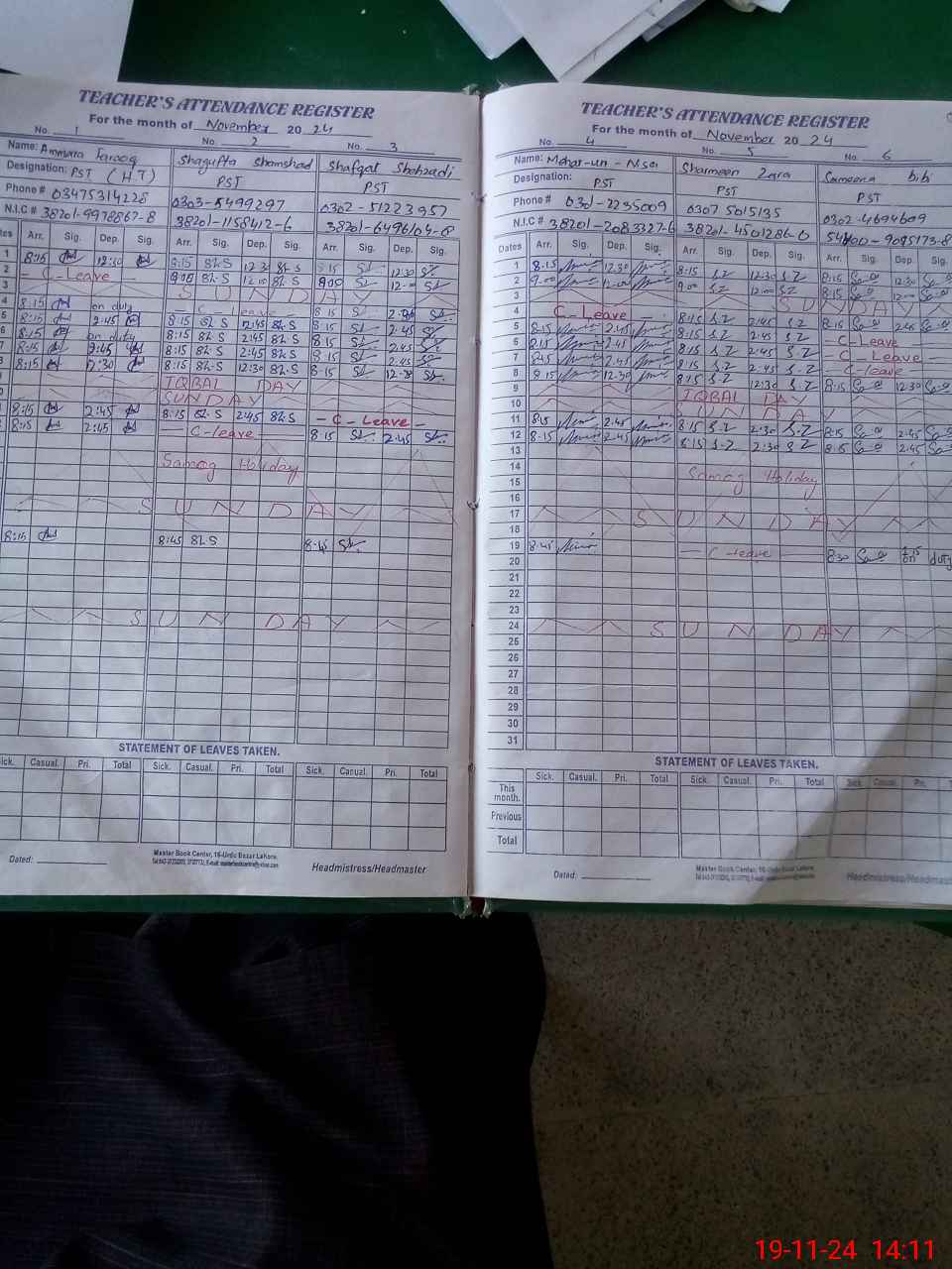 | CNIC | Full Name | Designation | R/C | Absence During Last Calender Month |