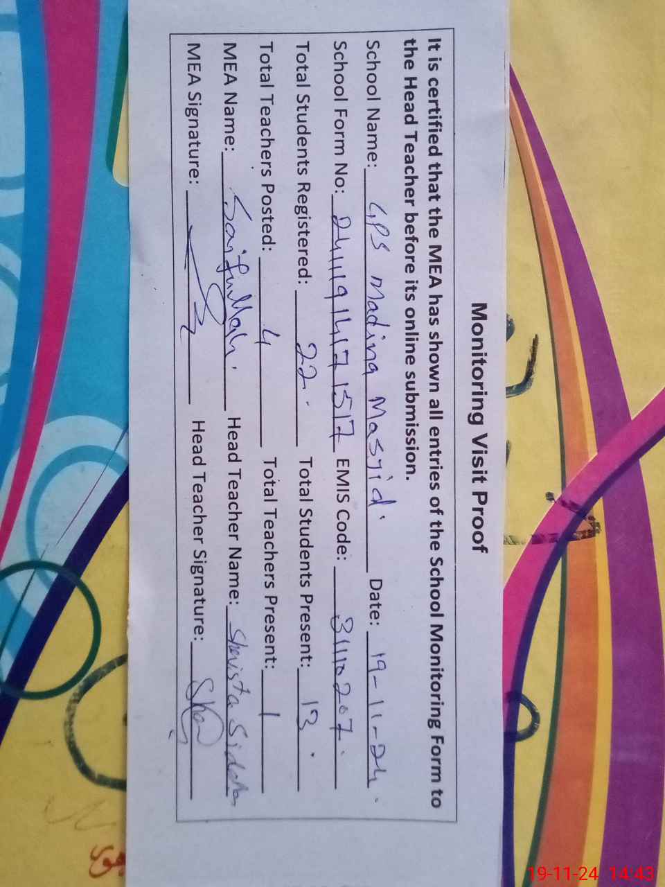 | Attendance Register | Head Teacher | MEA with School | Visit Proof |