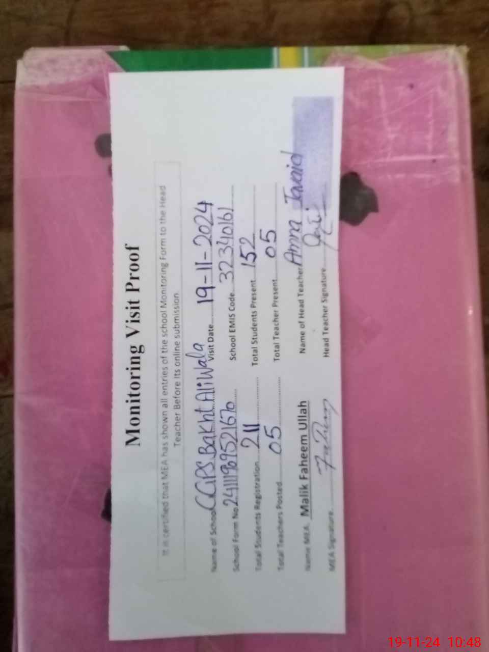 | Attendance Register | Head Teacher | MEA with School | Visit Proof |