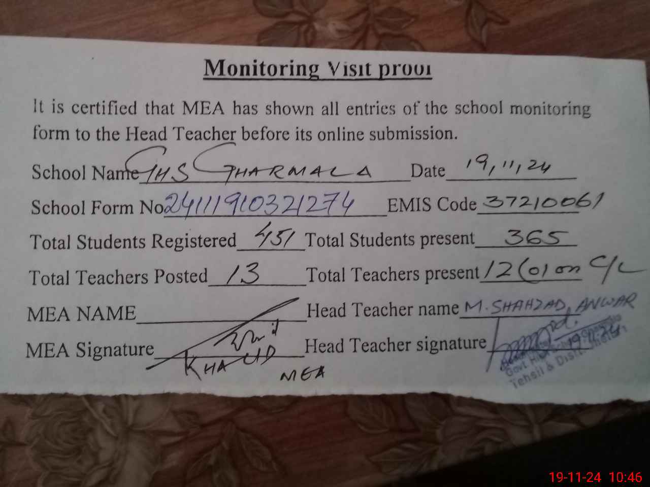 | EMIS Code: 37210061 | Name of School: GHS GHARMALA | |||