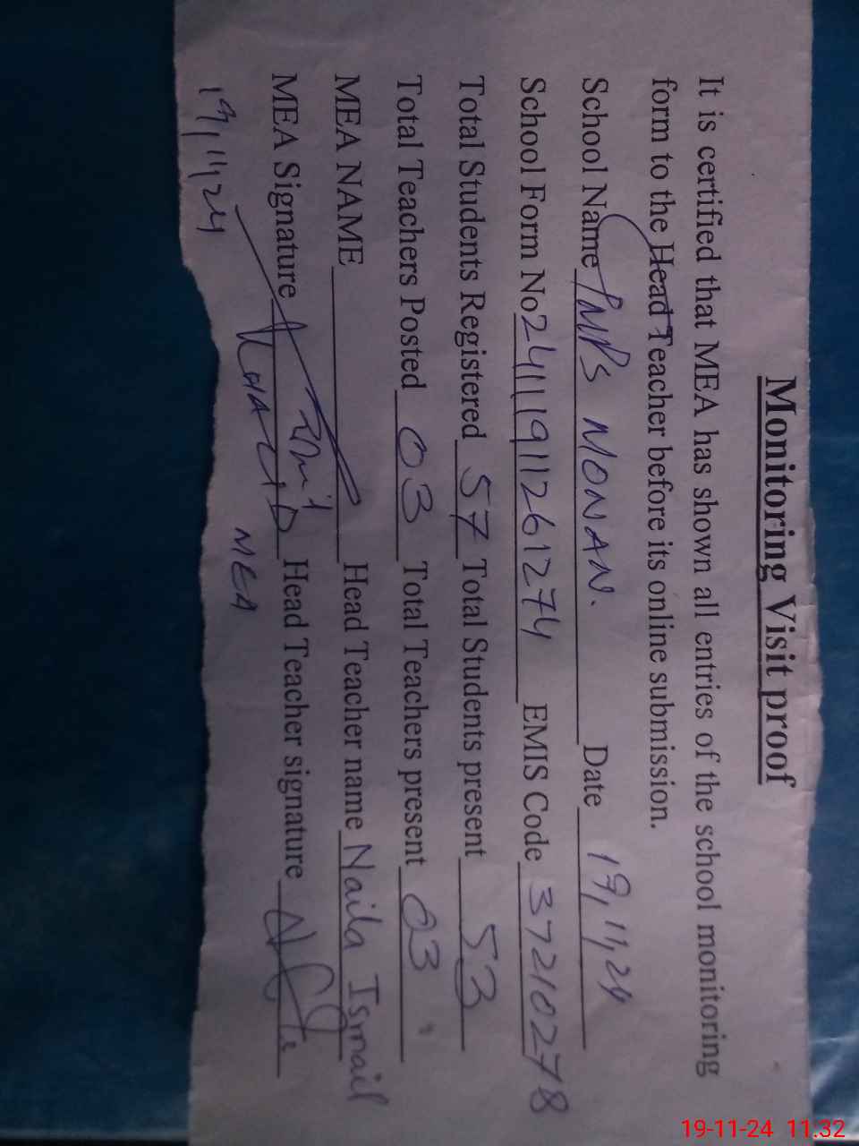 | Attendance Register | Head Teacher | MEA with School | Visit Proof |