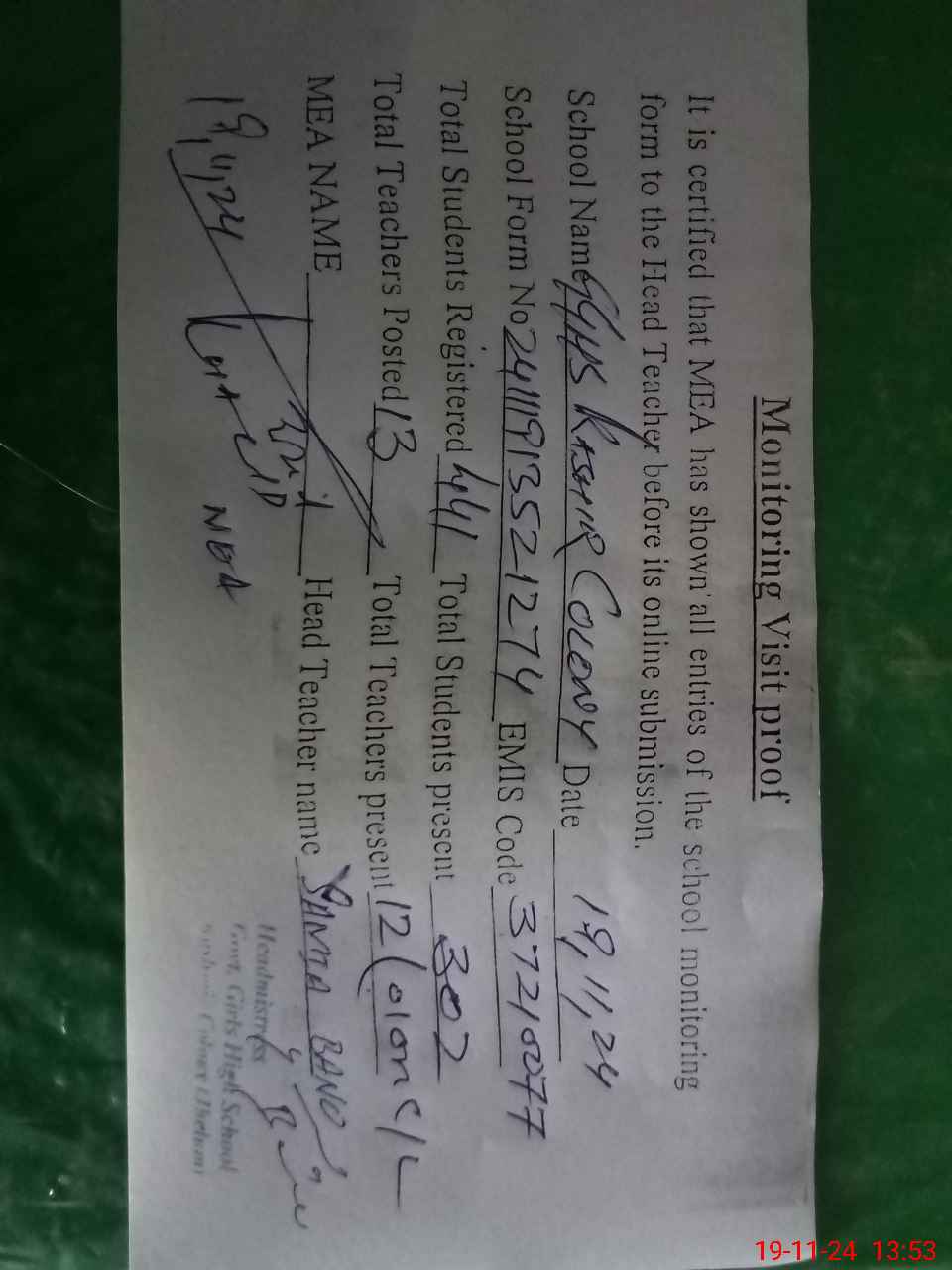| Attendance Register | Head Teacher | MEA with School | Visit Proof |