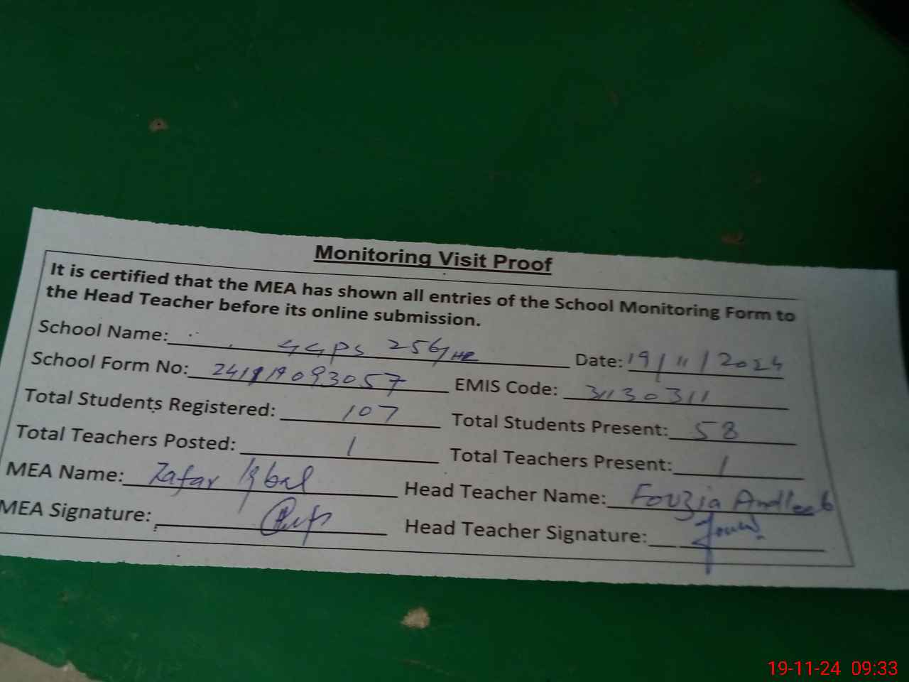 | Attendance Register | Head Teacher | MEA with School | Visit Proof |
