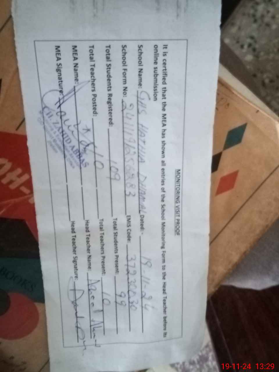| Monitoring Date: 19-11-2024 | Start Time: 19-11-2024 12:56 PM | End Time: 19-11-2024 01:30 PM | Name of MEA: Za**** Ab**** | |