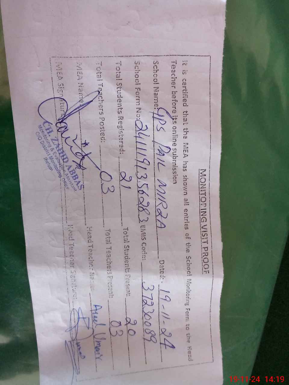| Monitoring Date: 19-11-2024 | Start Time: 19-11-2024 01:56 PM | End Time: 19-11-2024 02:20 PM | Name of MEA: Za**** Ab**** | |