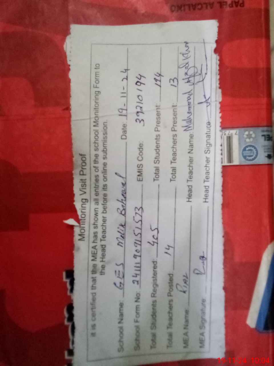 | Attendance Register | Head Teacher | MEA with School | Visit Proof |